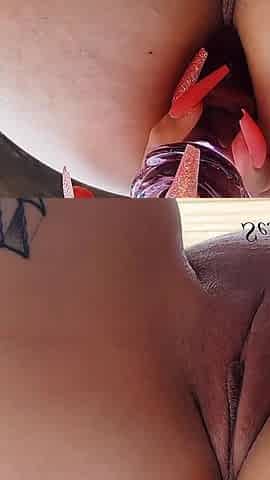 Turned on brunette nails shaved twat on joystick