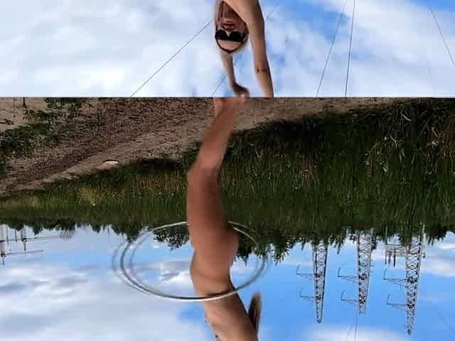 Exhibitionist girl spins hoop in Russian field