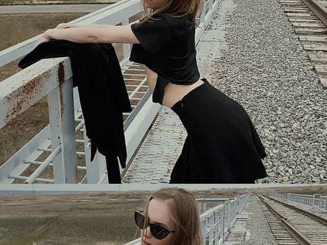 Naughty exhibitionist wife hikes sans underwear, flashes her pussy from the bridge