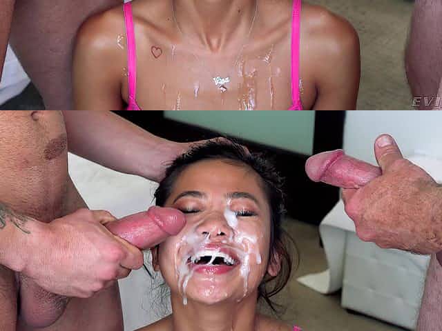 Slutty babe fucks three guys at the same time and her face gets covered with jizz