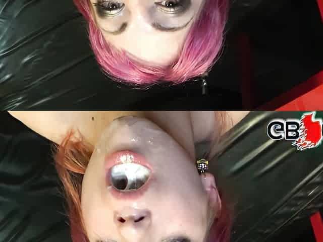 Whorish red head Margarite gets double penetrated and face fucked at the same time