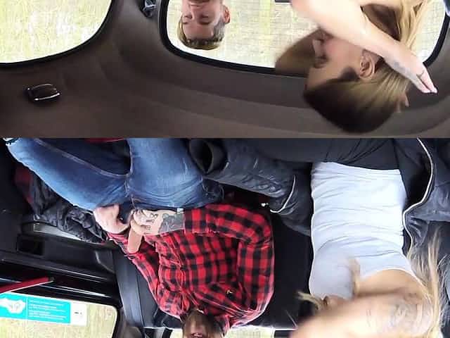 Blonde fucks in fake taxi beside highway at daylight