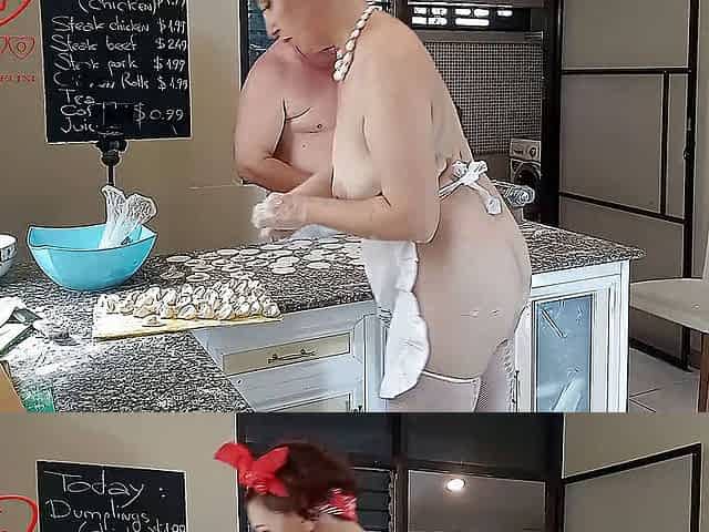 Nudist housekeeper Regina Noir cooking at the kitchen. Naked maid makes dumplings. Naked cooks. c 3