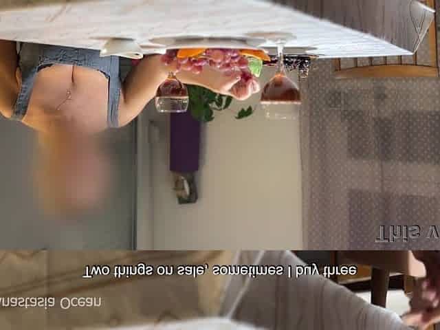 My spouse jerking hidden front of my step mommy below a table during their talk.