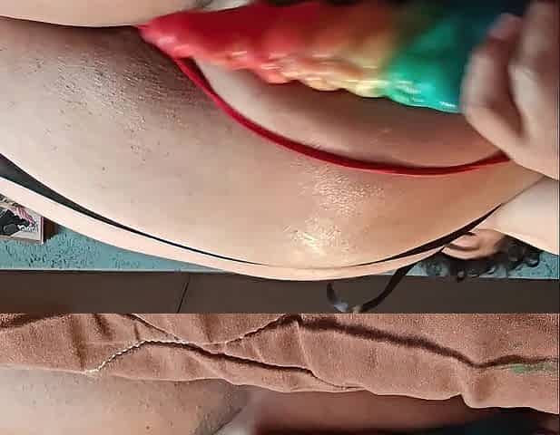 Plump sissy plays with her rainbow sex toy