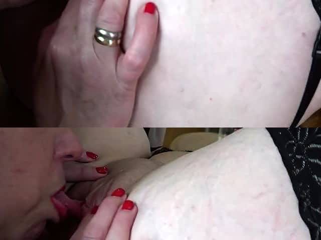 Fat blonde in black lingerie works her mouth and her pussy on a dick