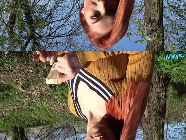 Smoking hot redhead rides big fat dong in the woods