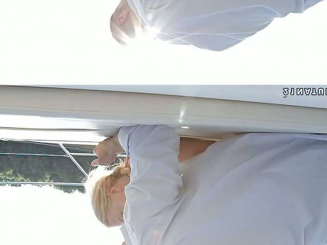 Zesty blond chic gives skillful blowjob to aroused fat sugar daddy on the boat