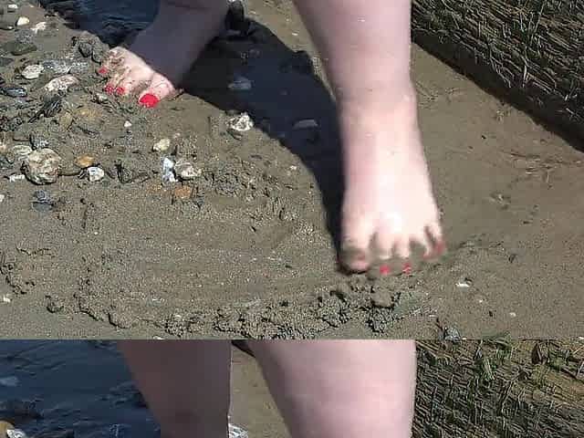 A obese woman with large feet walks along the shore.