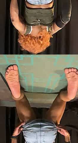 Femboy gives barefoot and naked-legged footjob to sex tool