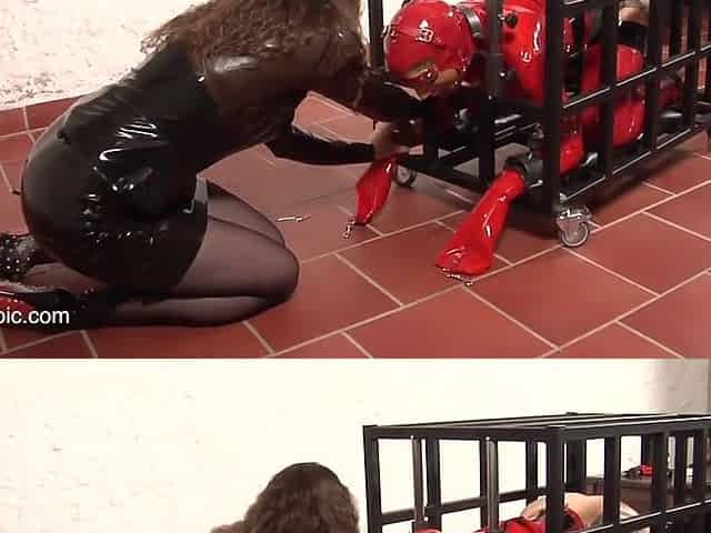 CFNM latex domina slaps and tramples sub in BDSM session
