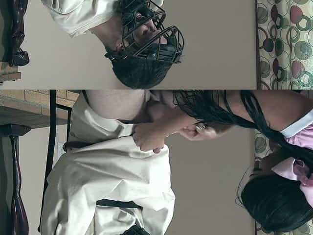 Darkhaired Babe femdom pegging masked slave