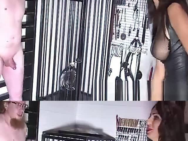 Femdom Goddess uses Strapon to make Chastity Slave Cum in Cage