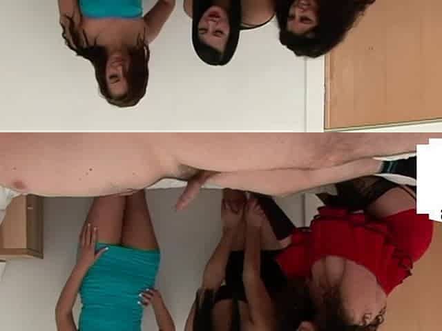 CFNM babes in 3some wanking guy cock and talking dirty