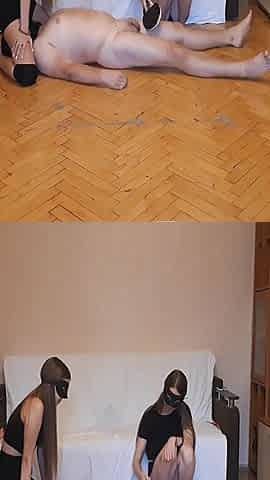 Two Horny Sluts Pleasing a Tied up Blonde Babe