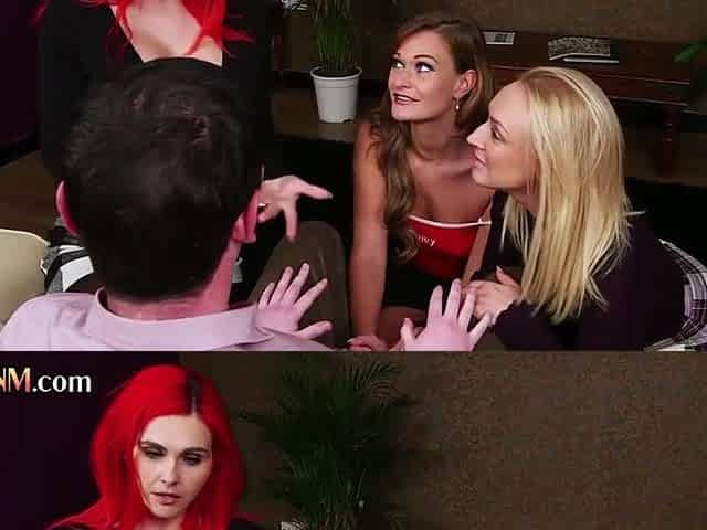 Group of stunning CFNM babes indulge in oral and handjob action with lucky man