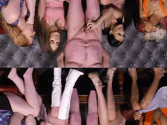 CFNM wanking action in group by femdom British babes