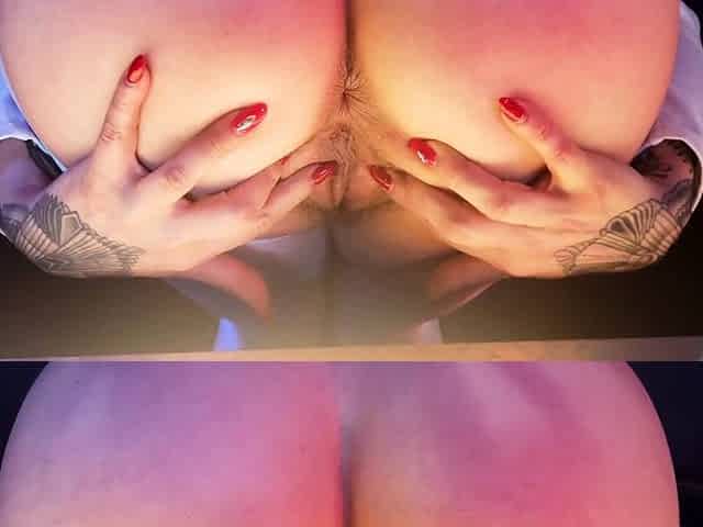 SPH busty inked babe in high heel boots wanks small pecker