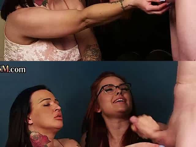 CFNM Femdom handjob babes in lingerie jerking cock in threesome