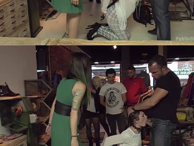 Brunette milf deepthroats a cock in BDSM scene in a shop