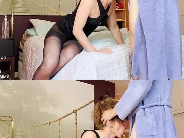 Close up. She Rubs and Sucks His Cock Until He Cums on Her Pussy. Dominatrix
