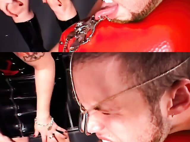 Gorgeous blonde mistress in a latex outfit Nicolette punishes her slave