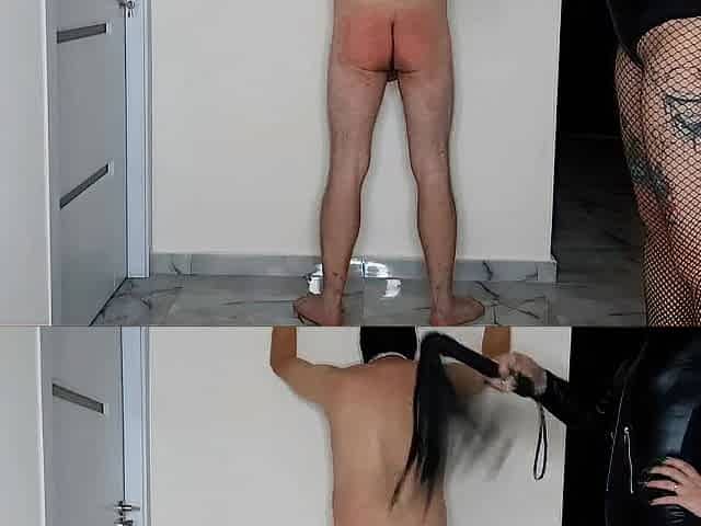 BDSM session. Dominatrix Nika spanked a slave on bare ass and whipped him on the back
