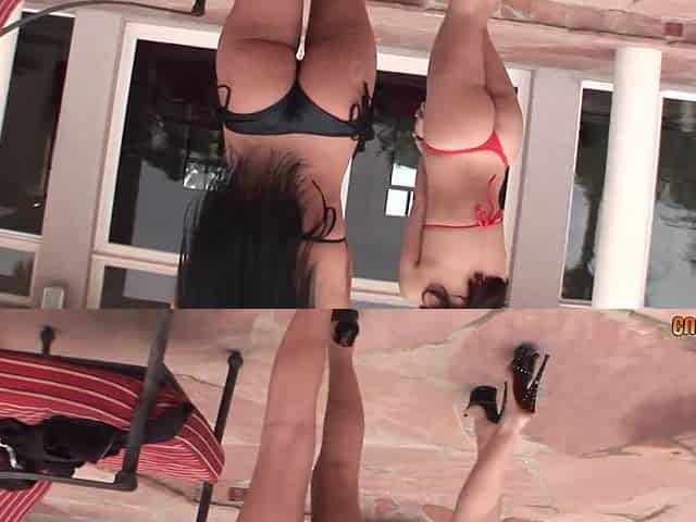 Hardcore FFM threesome with double blowjob by hotties in bikini