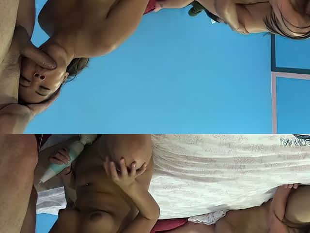 Two sweet teen girlies ride one big hard sausage with passion