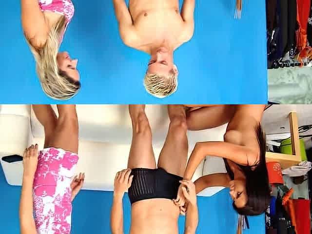 Beautiful woman in high heels and thong dominates Anita in a bdsm threesome