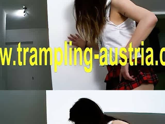 Stern redhead dominatrix trampling on her sub