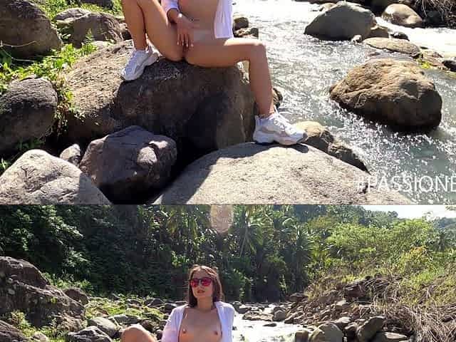 Girl in sunglasses undressed and rubbed herself in the outdoors