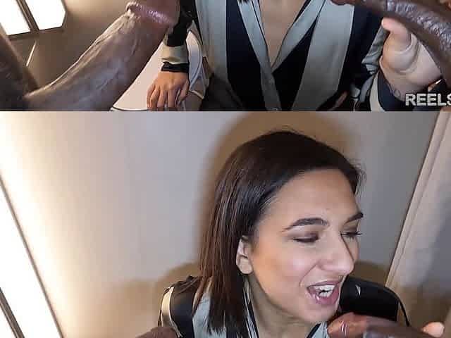 French babe enjoys anal threesome with brother's friends in the fitting room