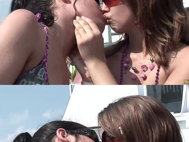 Bikini party girls on a boat flash their tits and kiss for the guys