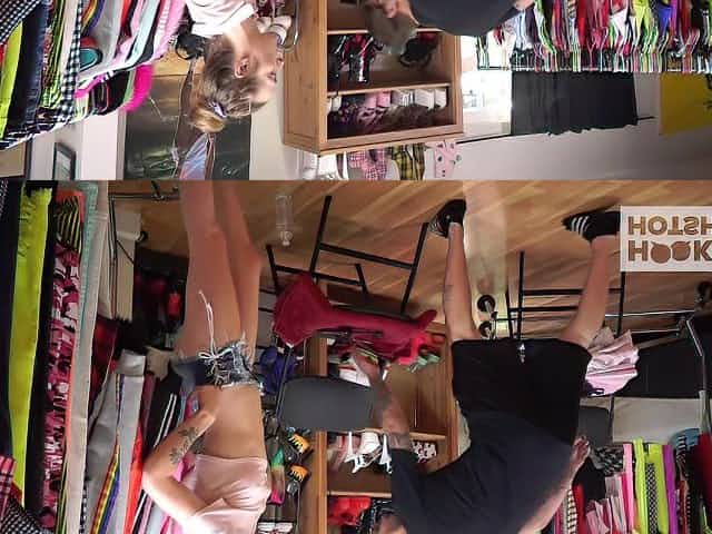British milf Tina Kay is trying on sexy thongs and flashing pussy upskirt
