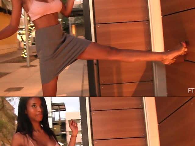 Dark haired ebony beauty Nia flashes her tits and pussy in public