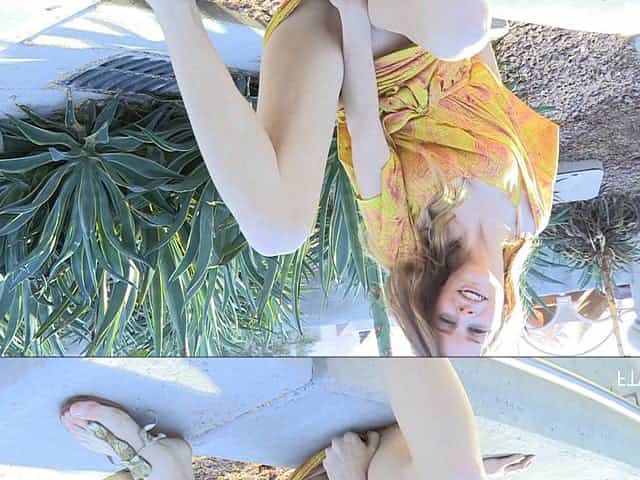 Sporty blonde babe Elexis stretches her perky ass in public