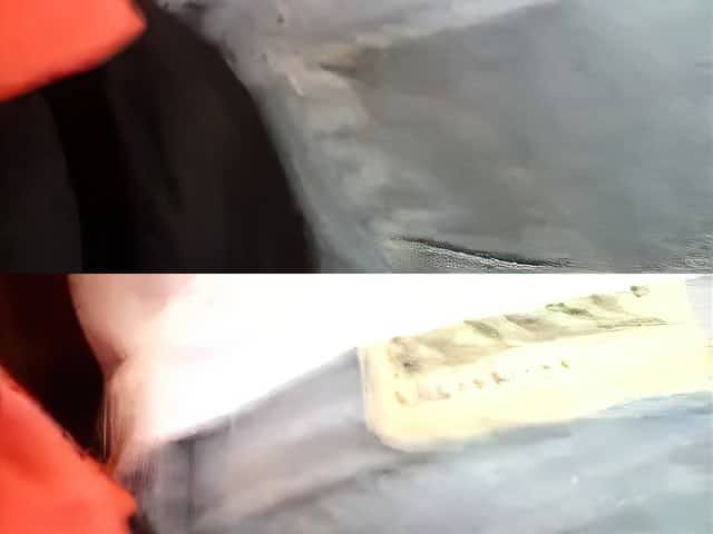 Blonde in coat bangs outdoor pov