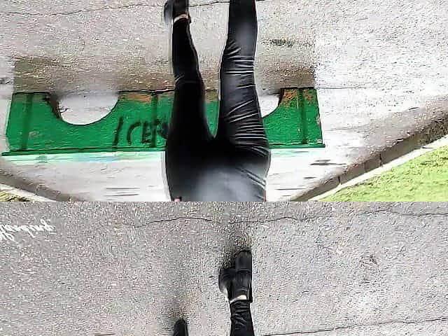 A cutie with a glamorous butt walks in an autumn park in leather panties and sometimes shows her bazookas