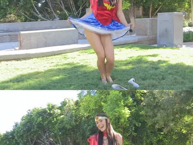 Magnificent teen babe is happily showing her pussy at public places