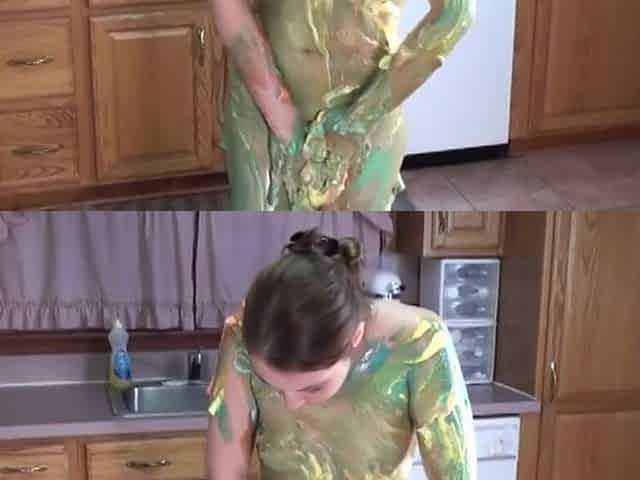 Beautiful slut paint her body with black paint on the floor