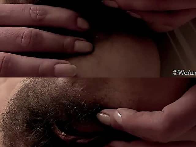 Tanned brunette hair with large, firm breasts, Ashley is fingering her perfectly bald vagina on the floor