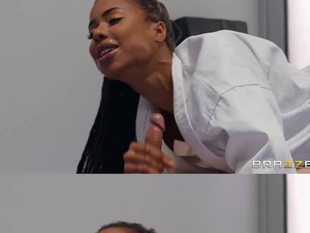 Black karate babe with small tits fucks young boy on the floor