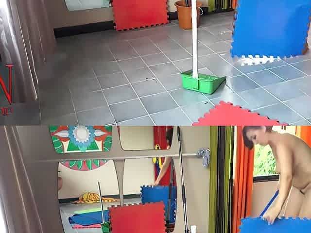 Nudist Maid Cleans The Yoga Room. A Naked Cleaner Cleans Mirrors Sweeps And Mops The Floor. S2 P1