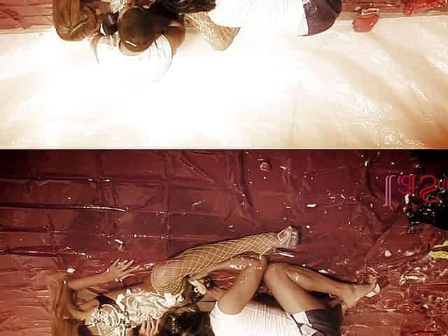 Lesbian brunette babes get naked and have dirty jelly wrestling