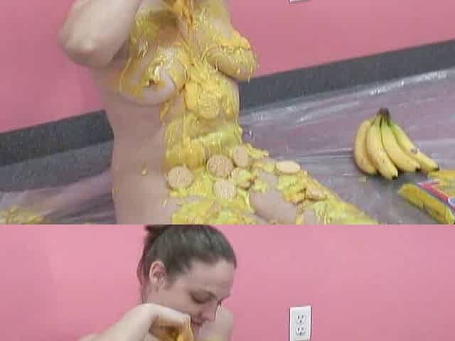 Chubby teen plays with custard
