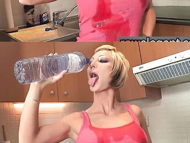 Beauty with natural melons fingers own pussy in the kitchen