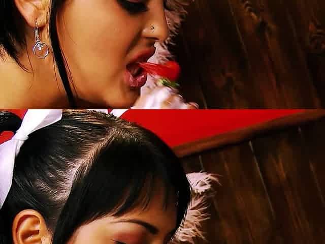 Dirty porn starlets Laila Mayhem indulge in carrot cake licking