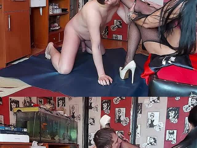 Slave: Clean the dirty feet of goddess Raven with your tongue and hold the cum!