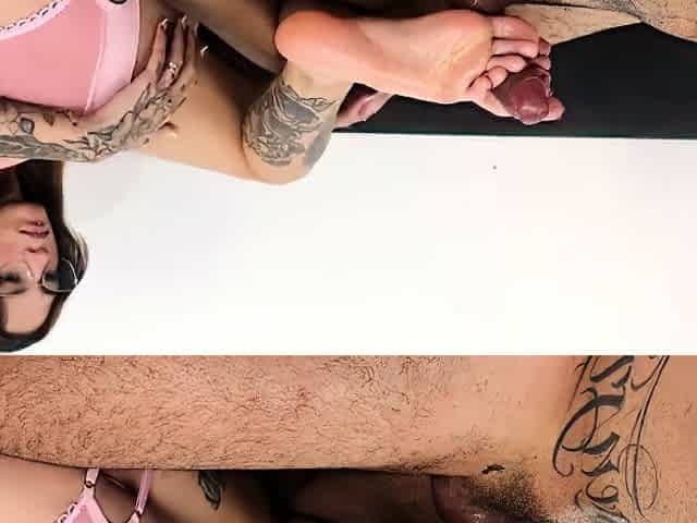 Playing with her cunt and jerking shlong with her feet